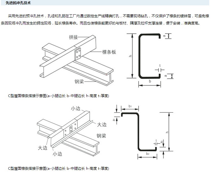 C型鋼是經(jīng)熱卷板冷彎加工而成的,壁薄自重輕,截面性能優(yōu)良,強(qiáng)度高,與傳統(tǒng)槽鋼相比,同等強(qiáng)度可節(jié)約材料30%。廣泛用于鋼結(jié)構(gòu)建筑的檁條、墻梁,也可自行組合成輕量型屋架、托架等建筑構(gòu)件。此外,還可用于機(jī)械輕工制造中的柱、梁和臂等。